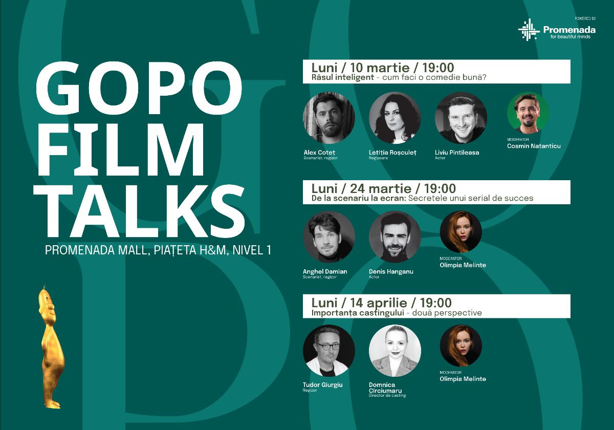 Începând cu luna martie, zilele de sâmbătă se transformă în discuții relaxate despre film, în cadrul Gopo Film Talks. O inițiativă a Premiilor Gopo, în parteneriat cu Promenada Mall și NEPI Rockcastle, menită să promoveze pasiunea pentru cinematografie și să faciliteze înțelegerea mai profundă a industriei de film românesc, prin interacțiuni directe între publicul cinefil și a studenților de la Facultățile de Teatru și Film cu personalități remarcabile din domeniul cinematografiei autohtone. Întâlnirile vor fi organizate sub forma unor dezbateri și conversații inspiraționale.