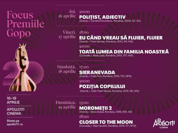 Premiile Gopo și Apollo111 Cinema invită publicul bucureștean la Focus Premiile Gopo — selecție aniversară, un maraton de film care aduce pe marele ecran titluri distinse cu trofeul „Cel mai bun film la Gopo” de-a lungul ultimelor două decenii.
