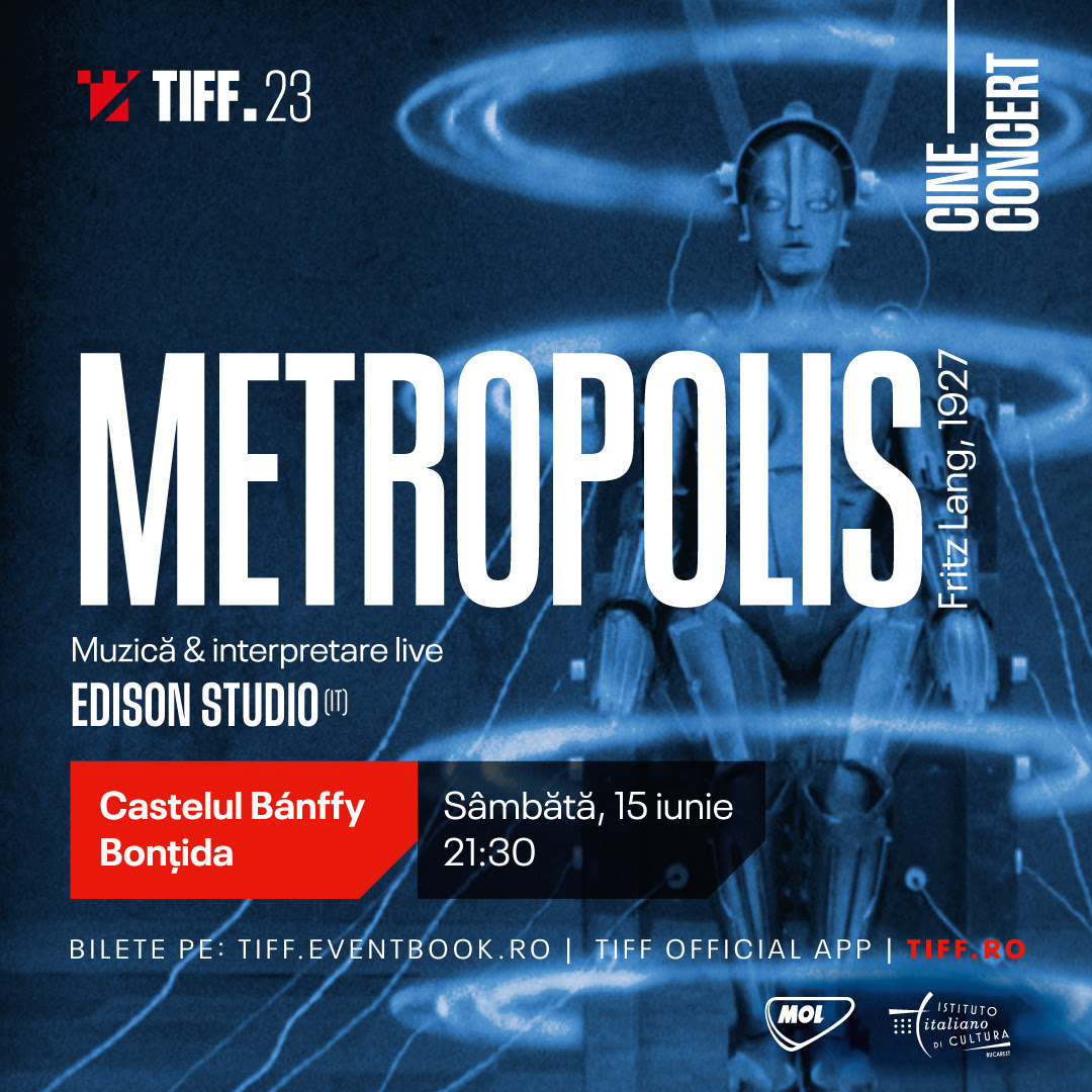 „Metropolis este una dintre marile realizări ale erei mute, o operă atât de curajoasă în viziune și atât de furioasă în mesaj încât este mai puternică astăzi decât atunci când a fost realizată” (Roger Ebert). O proiecție specială a filmului Metropolis (r. Fritz Lang, Germania, 1927) deschide lista de cine-concerte TIFF.23 (14 – 24 iunie 2024). Mega-producția expresionistă va fi proiectată, într-o variantă restaurată, în decorul Castelului Bánffy din Bonțida și va fi însoțită de muzica originală a italienilor de la Edison Studio. Cine-concertul Metropolis va avea loc sâmbătă, 15 iunie, de la ora 21:30. Biletele au fost puse în vânzare online – https://tiff.eventbook.ro